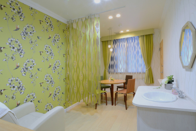 壁紙、間仕切りレース、窓のドレープカーテン・レースはホワイト系とグリーン系に統一して、ホッと癒される空間に仕上げました。